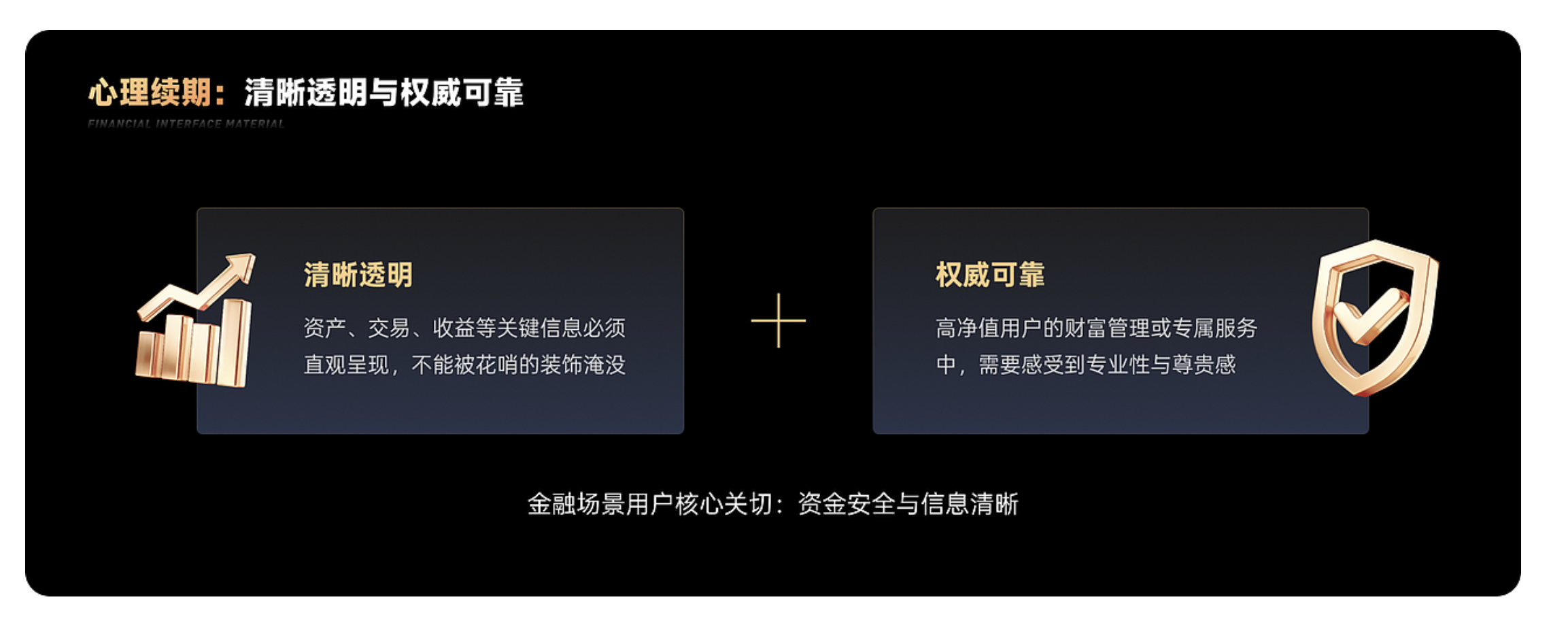 金融場(chǎng)景中,用戶的核心關(guān)切集中在兩點(diǎn):一是信息的清晰透明,二是服務(wù)的權(quán)威可靠。前者要求材質(zhì)不能遮擋關(guān)鍵信息,需通過(guò)通透、簡(jiǎn)潔的表現(xiàn)形式,讓資產(chǎn)、收益、交易記錄等內(nèi)容直觀呈現(xiàn);后者則需要材質(zhì)傳遞專業(yè)背書(shū),尤其是高凈值用戶,對(duì)專屬感與尊貴感的需求,本質(zhì)上是對(duì) “專業(yè)能力” 的隱性確認(rèn)。因此,材質(zhì)設(shè)計(jì)必須在 “清晰傳遞” 與 “價(jià)值彰顯” 之間找到平衡。