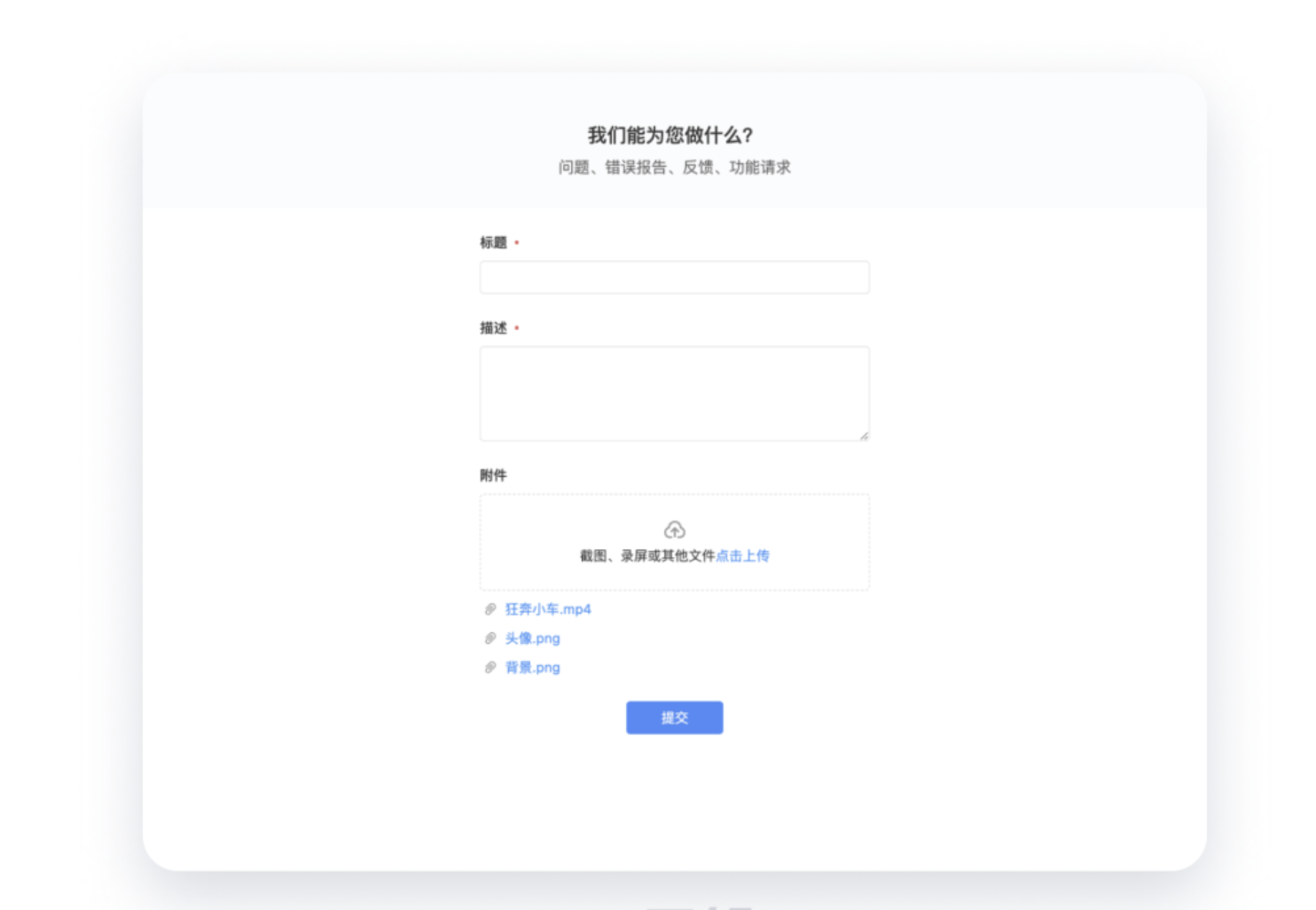 示例場(chǎng)景:簡(jiǎn)單的錯(cuò)誤報(bào)告表單,僅包含 "問題標(biāo)題"" 描述 ""附件" 三個(gè)字段,采用單列布局讓用戶快速完成提交。