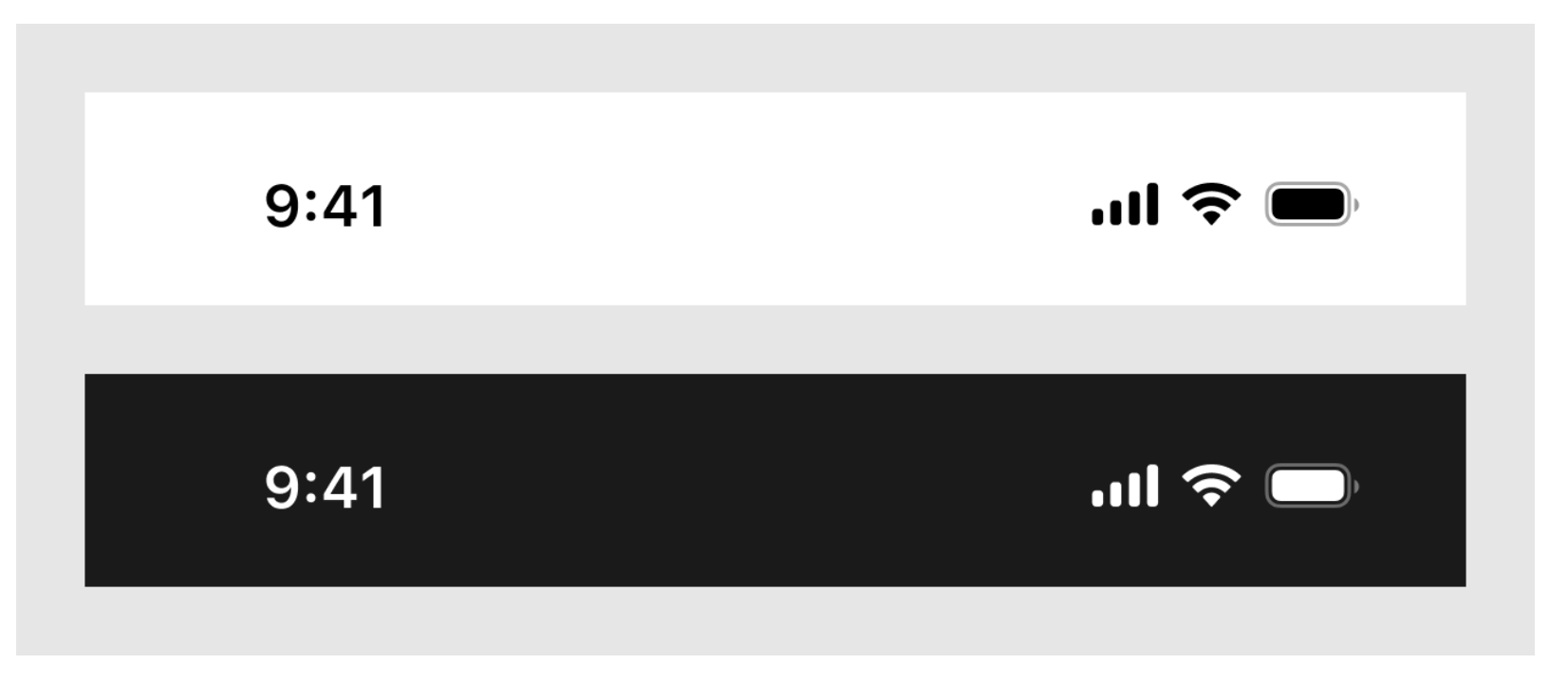 位于屏幕頂部邊緣,核心功能是展示設備狀態信息,包括時間、運營商、電池電量等。豎屏模式下幾乎所有頁面強制顯示,僅全屏視頻、圖片等場景可暫時隱藏。狀態欄僅支持黑白兩色,選擇標準以 “與背景對比度最高” 為原則,iOS 會自動適配,設計師需避免設計稿中出現對比度不足的情況。