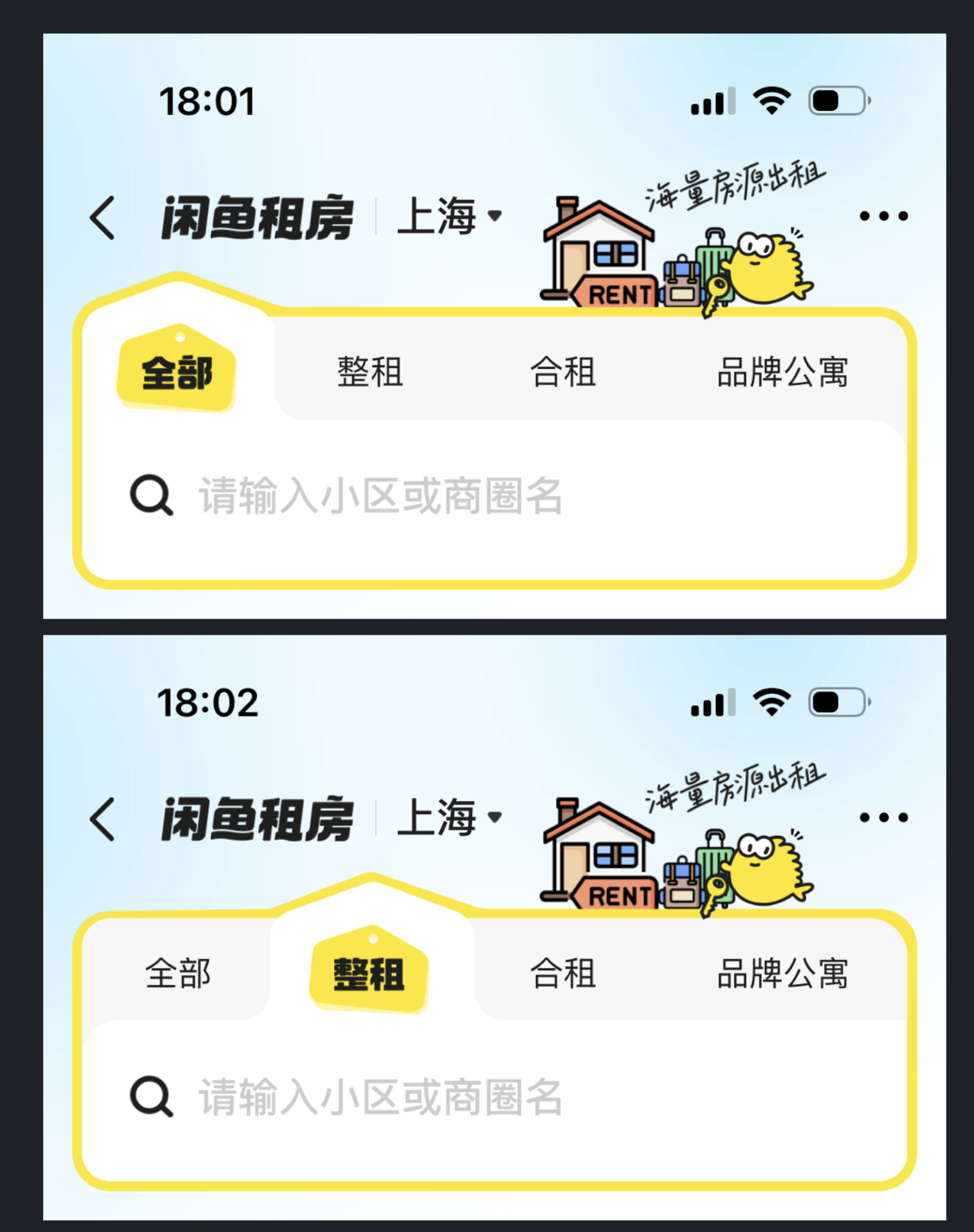 閑魚租房欄目的卡片設計便是典型,它摒棄了常規的矩形卡片框架,將房屋結構的輪廓融入卡片造型,用極簡的幾何圖形還原戶型特征,既貼合租房的業務核心,又讓卡片設計跳出了同質化的視覺桎梏。這種將業務特征與視覺設計結合的方式,不僅讓卡片更有辨識度,還能讓用戶一眼感知到功能屬性,實現了美觀與實用的雙重效果。