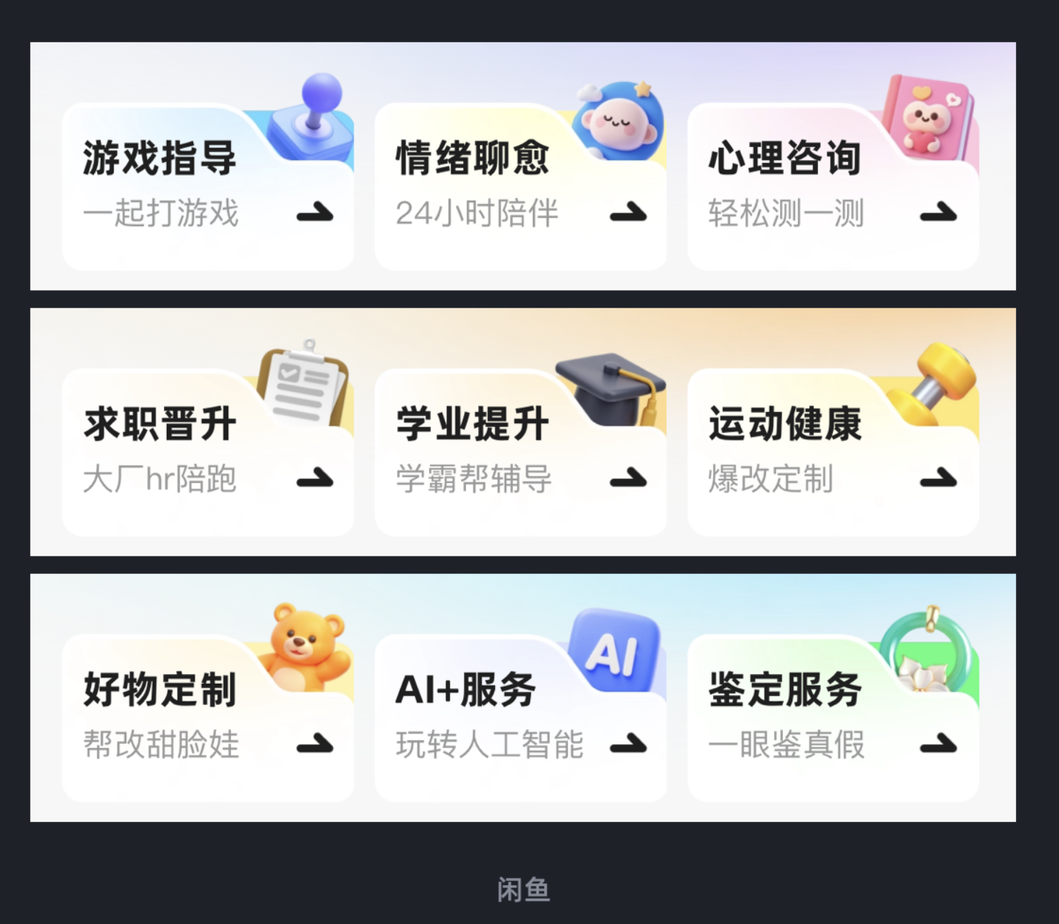 閑魚副業欄目的設計將這一點發揮得淋漓盡致,首先讓卡片一角做凹陷的異形處理,把功能圖標精準嵌入凹陷區域,形成 “卡片 - 圖標” 的貼合感;再通過背景卡片的色彩與層級襯托,讓整組設計形成多層疊加的視覺效果。異形卡片打破了常規的規整感,圖標與凹陷的結合讓元素布局更巧妙,多層結構則進一步強化了模塊區分,讓整個界面既富有設計感,又能讓用戶快速識別不同功能模塊。