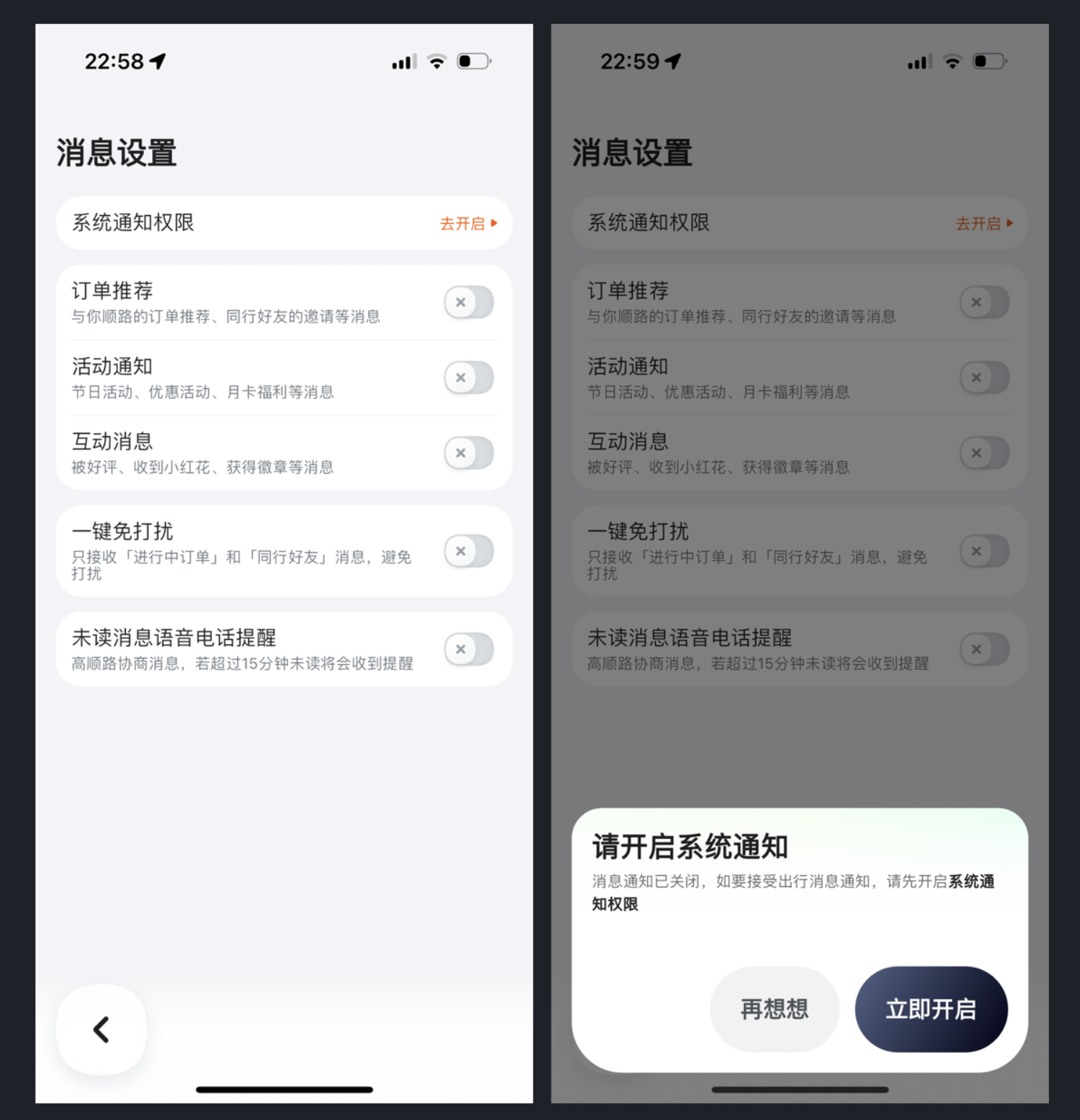 嘀嗒出行的消息設置設計就極具人性化,它沒有刻意弱化關閉按鈕,反而讓操作更直觀;同時為了避免消息過度干擾,特意設計了 “一鍵免打擾” 功能,讓用戶可自主選擇僅接收核心消息。這種設計摒棄了 “單向引導” 的思維,而是賦予用戶選擇權,既實現了引導開啟通知的核心目的,又兼顧了用戶的使用體驗,讓交互設計更有溫度。