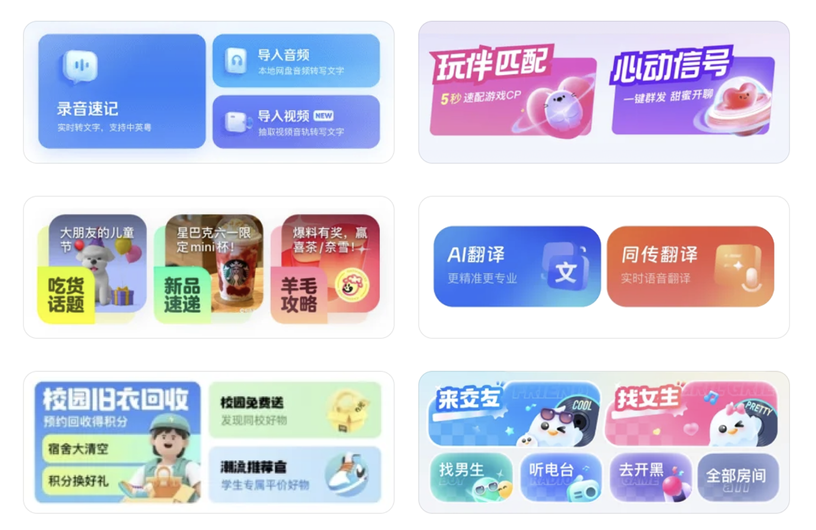 這樣的排版,既讓用戶一眼看到核心功能,不用在一堆卡片里找重點,又讓頁面有高低起伏的節(jié)奏感,不會顯得呆板。