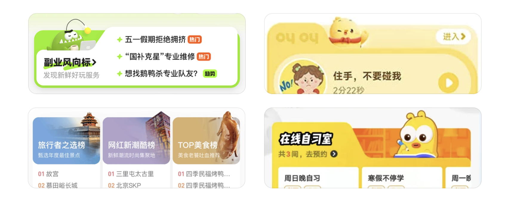 比如外賣 APP 的首頁功能區(qū),“外賣點餐” 是核心高頻功能,做超大卡片;“超市便利”“水果生鮮” 是次要功能,做中尺寸;“跑腿”“充值” 是輔助功能,做小尺寸。