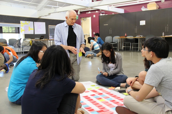 (圖為學員們在D.School用便利貼和海報紙來記錄想到的點子,白發老爺爺是D.School的講師,以前是Yahoo的PM,專門帶Ideate這一部分,講師們都有自己最擅長和最喜歡帶的一個模塊)