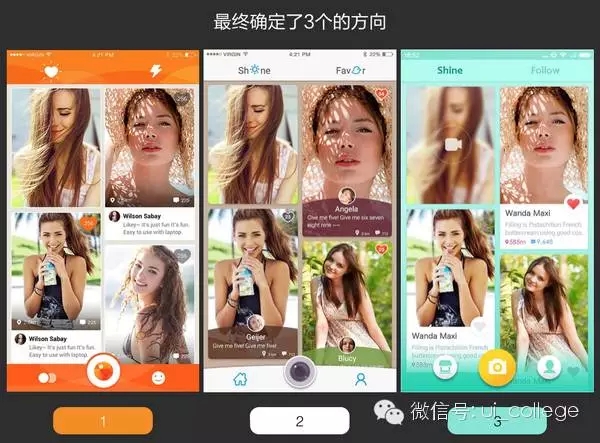 最后如上圖,根據(jù)評(píng)審我們選出了票數(shù)最高的三個(gè)不同風(fēng)格的方案,理論上我們認(rèn)為這三個(gè)方案都是正確的、內(nèi)部達(dá)成一致、且都符合我們?cè)凇呵楦嘘P(guān)鍵詞』 和『情緒板』分析時(shí)『陽光溫暖年輕』的設(shè)計(jì)目標(biāo)。但是三個(gè)是不同風(fēng)格各有千秋,而且我們都挺喜歡的,要怎么抉擇呢?最后就要試探一下用戶的感覺了。
