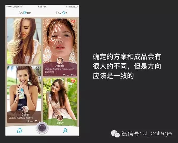這些問題會(huì)扯出很多主觀表達(dá),設(shè)計(jì)師同學(xué)一邊聽大家討論一邊把聽到的關(guān)鍵詞記在黑板上。比如我們是想做年輕人的視頻社交產(chǎn)品,我們就會(huì)記下諸如好 玩、熱情、豐富、可愛、二次元等各種情感關(guān)鍵詞,這都是團(tuán)隊(duì)成員希望這個(gè)產(chǎn)品成為的樣子。但是在做視覺設(shè)計(jì)的時(shí)候收集的目標(biāo)不能太多,于是征求大家建議 后,我們把優(yōu)先級(jí)不高的去掉,把重復(fù)的感受合并,最后確認(rèn)了我們產(chǎn)品的情感關(guān)鍵詞是:陽光、溫暖、年輕。也就是說,接下來我們做App的視覺設(shè)計(jì),就應(yīng)該 做出陽光、溫暖和年輕的感覺。