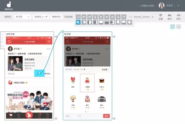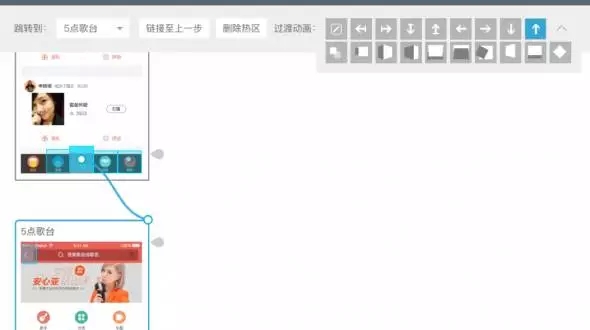真實的app中,頁面間常常通過方向來示意層級關(guān)系,例如重新創(chuàng)建的流程,通常創(chuàng)建頁面會從底部向上呼起,于是,在建立熱區(qū)鏈接過程時,我們需要對鏈接進(jìn)行方向設(shè)定。如圖示,我將點歌臺呼起的頁面出現(xiàn)形式,設(shè)定為從下往上出。如果不是很確定切換效果,Demoo很細(xì)心的在這里設(shè)計了動畫預(yù)覽,鼠標(biāo)停留在小方塊上時,會有微動畫示意,多看幾遍也就明白了。