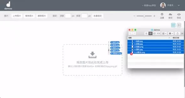在設(shè)計工具中,我已經(jīng)設(shè)計好了全民K歌5個主要頁面的圖并命名好保存在文件夾中,準(zhǔn)備開始制作原型。如圖所示,Demoo支持批量導(dǎo)入圖片,將我需要的圖片全部選中,拖放到虛框內(nèi),即可完成圖片導(dǎo)入工作。導(dǎo)入后,就相當(dāng)于你已經(jīng)把app原材料都放到工作臺啦,之后操作起來就會特別方便。