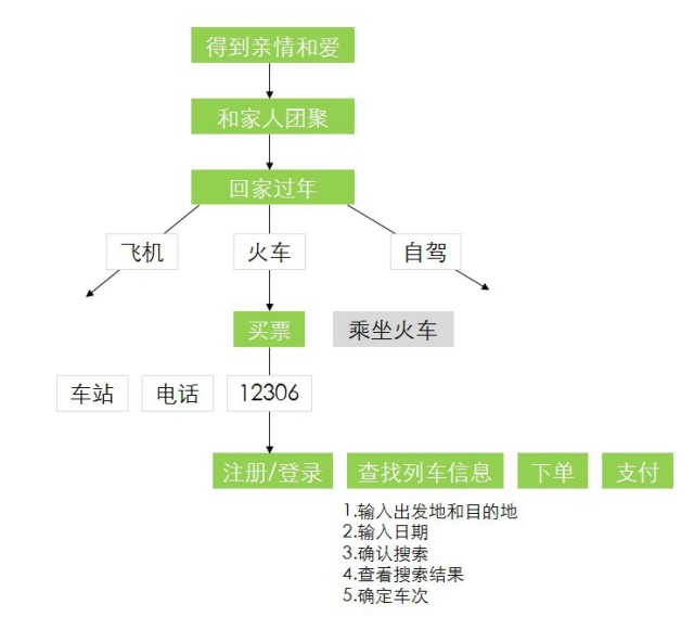 比如“訂票”是過年回家這個(gè)目標(biāo)的任務(wù),但是卻是12306注冊登錄、搜索車票、預(yù)定、支付任務(wù)的目標(biāo)。