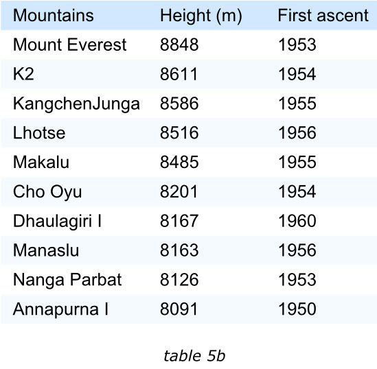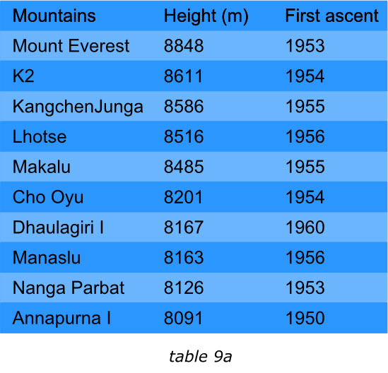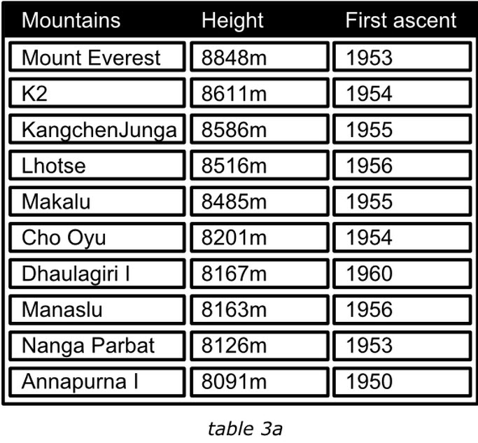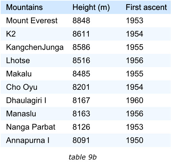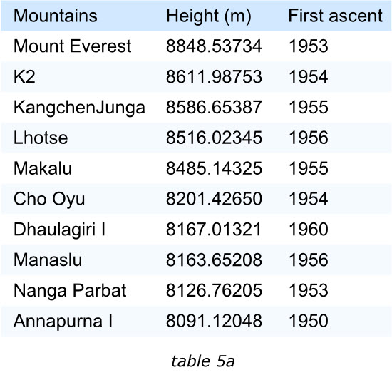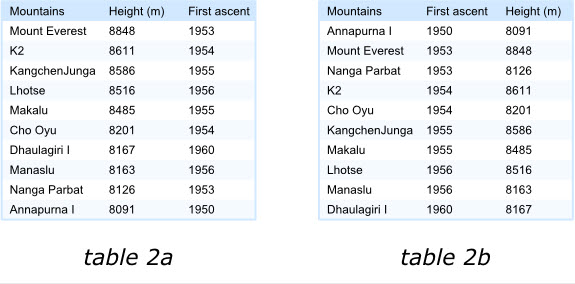 表格中的項(xiàng)目應(yīng)該通過某種排序的手段來(lái)滿足閱讀者的興趣。我們來(lái)看下面的兩個(gè)表格,左面的展示了世界上最高的十座山峰,鑒于“高度”最受關(guān)注,那么表格的項(xiàng)目就是按照這個(gè)字段降序排列的。這樣最受關(guān)注的信息能夠排在表格的最前面。