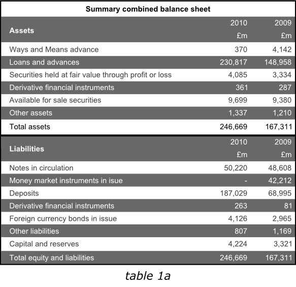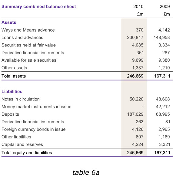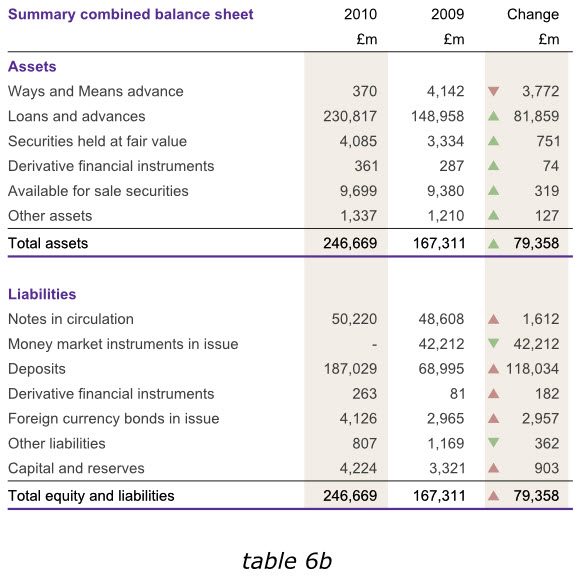在英格蘭銀行2010年度報(bào)告中,盡管我們不能通過改變數(shù)據(jù)來(lái)達(dá)到讀者的期望,但是在其他同樣的報(bào)告中,我們?cè)谀┪苍黾右涣杏杏玫臄?shù)據(jù),以避免用戶在比較各年度數(shù)據(jù)的時(shí)候,還需要自行計(jì)算增長(zhǎng)或減少的幅度。下面第一個(gè)表格6a已經(jīng)增加了總資產(chǎn)和總負(fù)債數(shù)據(jù),而表格6b則在右側(cè)增加了新的一列,使我們更容易分析出哪些領(lǐng)域的經(jīng)營(yíng)成果發(fā)生了實(shí)質(zhì)性變動(dòng)。