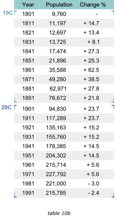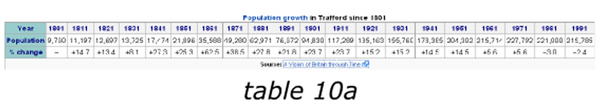 當(dāng)我們?cè)谧珜憌ikipedia上的Trafford條目時(shí),有一個(gè)1801至1991年的人口變化表格10a,他包含有2行20列,讀者必須記住有關(guān)信息,并且不停的對(duì)照表頭和數(shù)值來(lái)確認(rèn)他們的關(guān)系,否則他們就無(wú)法獲得趨勢(shì)信息。
