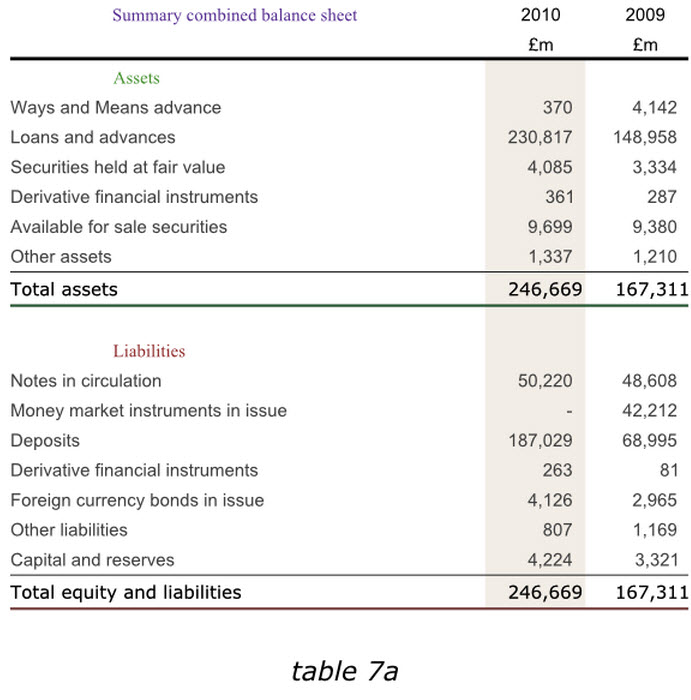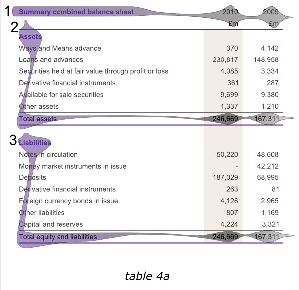 在表格中尋找信息時(shí),讀者希望前后采用同樣風(fēng)格,你應(yīng)該保證對(duì)同類元素使用同樣的字體,對(duì)同類數(shù)據(jù)使用同種對(duì)齊方式,還有諸如“列標(biāo)題”等各種突出顯示元素的一致性。看一下下面的表格7a,他展示了和前面表格1b同樣的英格蘭銀行2010年度數(shù)據(jù)信息。但是使用了有區(qū)分的表頭字體,標(biāo)簽以及加總格式,表頭采用了居中格式而不是和數(shù)據(jù)一樣右對(duì)齊,加總數(shù)據(jù)也沒有與數(shù)據(jù)嚴(yán)格對(duì)齊,同時(shí)為了區(qū)別資產(chǎn)和負(fù)債表格,他分別采用了不同顏色的字體,和表格中間粗細(xì)不同的線條。而所有這些實(shí)際上都讓我們產(chǎn)生一種不連貫的感覺,從而給瀏覽表格,把握重點(diǎn)帶來(lái)難度。