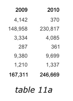 在表格10a和10b中我們已經(jīng)了解到,當(dāng)數(shù)據(jù)處于一列的時(shí)候,人們很容的可以比較數(shù)據(jù)并發(fā)現(xiàn)趨勢(shì)。瀏覽者可以快速的從上之下掃描縱向數(shù)據(jù),而對(duì)于長(zhǎng)距離的橫向數(shù)據(jù),瀏覽就會(huì)遇到困難。然而我們?cè)賮?lái)看一下表格11a,去掉了所有的裝飾框,當(dāng)我們比較2009年和2010年數(shù)據(jù)的時(shí)候,數(shù)據(jù)橫向擺放要比11b中的上下擺放容易的多。