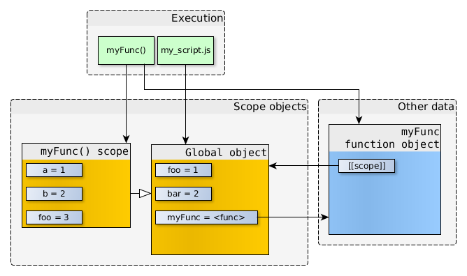 在上面的代碼中,我們有一個執行的上下文(myscript.js自身的代碼),以及它所引用的作用域對象。全局對象里面還含有很多不同的屬性,在這里我們就忽略掉了。