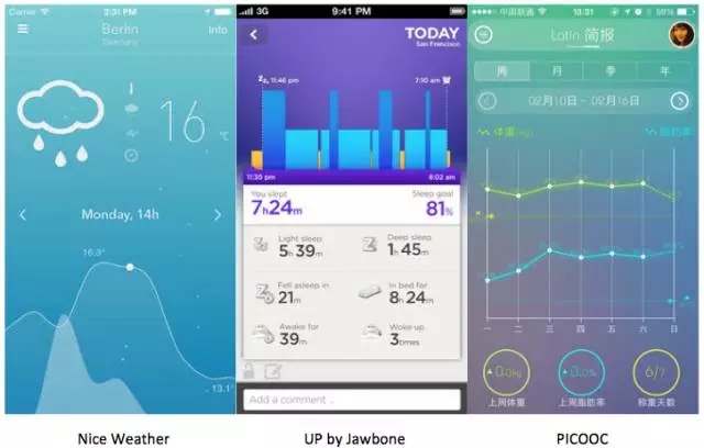 Nice Weather用曲線圖來表達溫度的變化,Jawbone UP用柱狀圖來表達每天的完成情況,PICOOC用折線圖來表達每天體重、體脂的變化。移動APP利用數(shù)據(jù)可視化,可以在更小的屏幕空間內(nèi),更立體化的展示內(nèi)容。