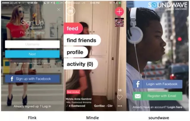 大視野背景圖風格也分為兩種,一種像Secret、The Whole Pantry這樣的,內(nèi)容區(qū)塊中采用大視野背景圖,好處是可以利用圖片做區(qū)塊分割,難度是圖片拼接后的效果不一定好看,所以可能還需要配合描邊、留白等設計手段優(yōu)化拼接。另外一種就是想Vsco、Flink、Mindie、Soundwave這樣的,全屏背景圖甚至打通狀態(tài)欄,前景做內(nèi)容排版、導航、操作。好處是設計非常具有生命了,所有有朋友把這種風格也叫有計劃設計,說的就是回歸大自然的設計手法。但風險也是很明顯的,就是前景的信息排布設計其實是有很大挑戰(zhàn)的,必經(jīng)花花綠綠的背景太過于干擾注意力,導致前景的文字內(nèi)容可讀性會變?nèi)酢K孕枰阎匾僮饔妹鞔_的按鈕區(qū)隔出來,閱讀型文字跟背景圖要用明顯的反色,還是不行的話就把文字浮在半透明蒙層上,解決可讀性問題。