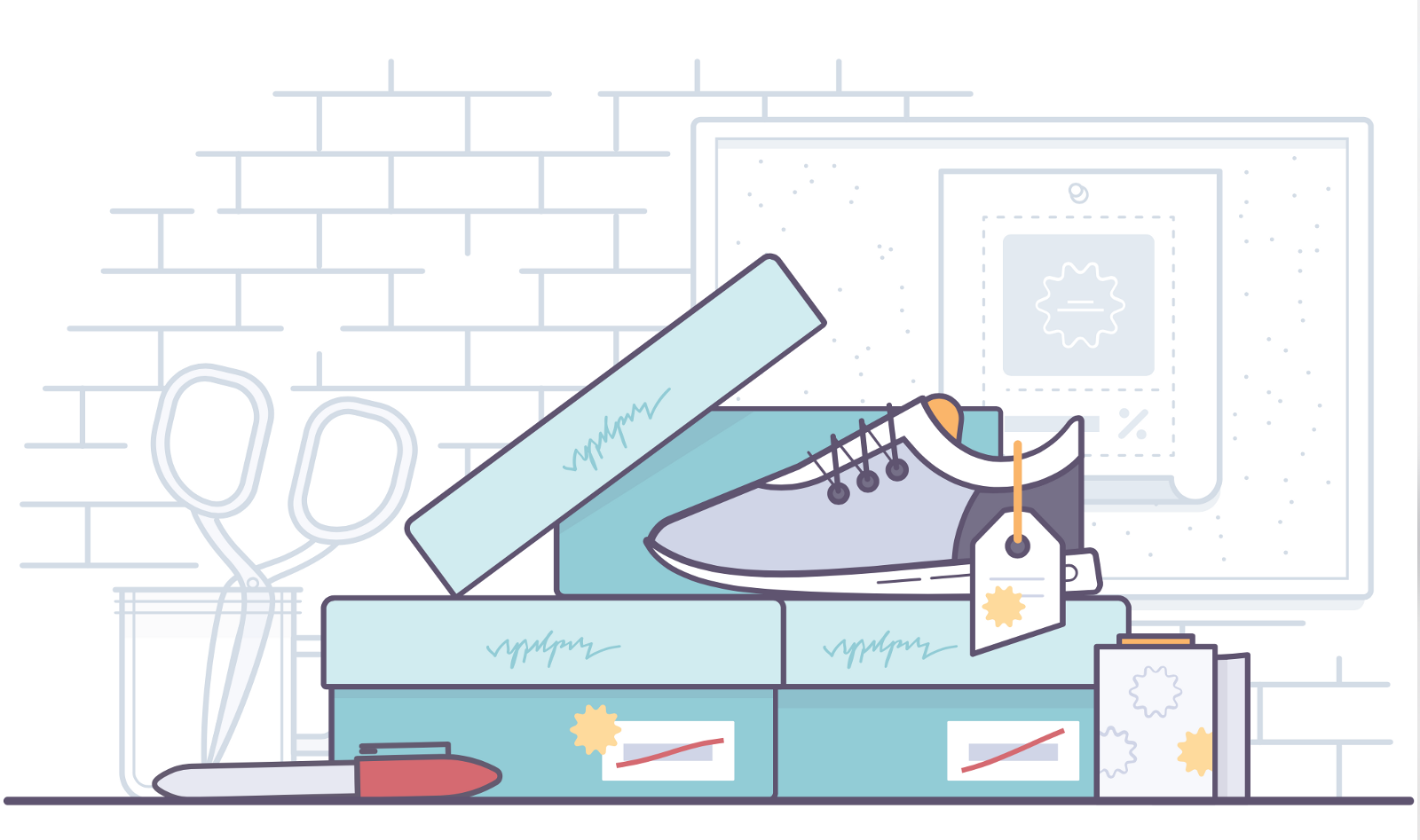 這個元素在線上和線下有相似之處。盡管我不認為它是一類比喻,但在產品設計中我還是將它單獨拿出來說。比喻常用來展現觸動人心的部分,那是一件事情或者一個行動產生的積極感覺。不過,對于內容傳遞給用戶的方式,團隊更傾向于中立的寫實表達。不必告訴用戶我們的感受如何,只需簡潔傳達信息。用插畫的專業術語來表達則是:我們只愿意通過繪制寫實狀態下的物品,來幫助用戶理解線上的內容。當然,談到產品時,我們大多是在電腦上作畫,比如,你可以繪制20多個互相連接的空狀態頁面,來表達重復性。這也是我們在為用戶傳達內容時增加的一種類比方式。比如下圖的例子,線上電子商務可以讓用戶通過優惠碼輸入實現折扣,那么線下實體銷售折扣該如何表達呢?可能是一堆貼紙和帶著折扣價格的紅色標記。我們能借助全新懷舊風格的插畫為用戶帶來愉悅,同時還能保持中立,只是簡單清晰的表達信息。
