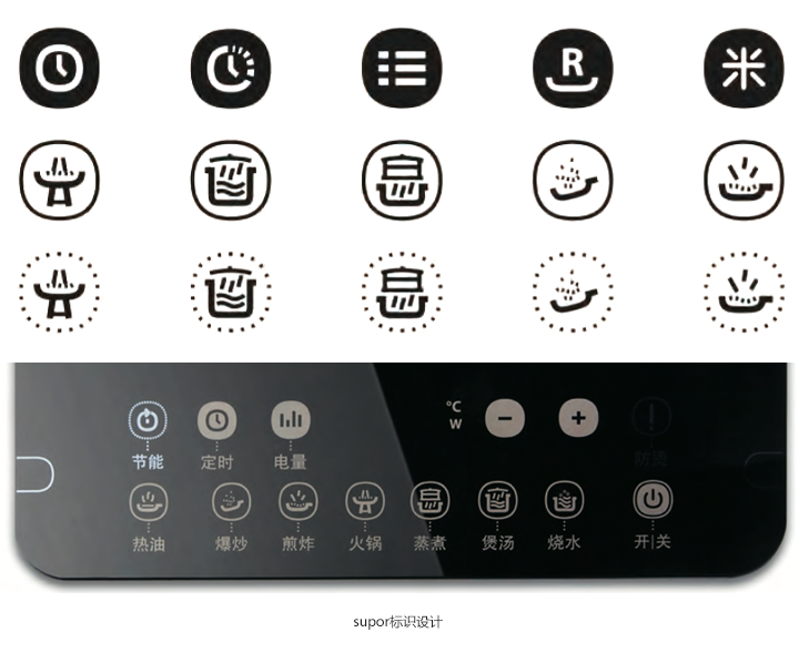 蘇泊爾標識系統吸收了米字格和“永字八法”,將所有圖標元素看作是漢字的八個筆畫,運用八個筆畫元素按照“米字格”的網格系統再組合,設計出蘇泊爾標識系統的所有標識。