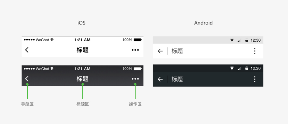 微信導航欄分為導航區域、標題區域以及操作區域。其中導航區控制程序頁面進程。目前導航欄分深淺兩種基本配色,在iOS和Android展示有所不同,如下圖所示: