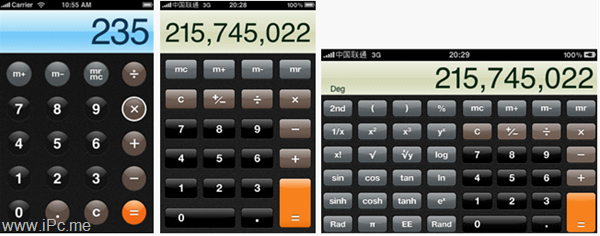 iPhone游戲里出現橫豎屏設計比較正常,都是視具體的游戲類型來分。但一般的效率型應用或實用工具,也是橫豎屏都有。林子大了,什么鳥都有,有 些用戶就是喜歡經常將屏幕旋轉過來,而且還不在少數。他們或是喜歡橫屏的瀏覽方式(如備忘錄、音樂),或是希望打橫可以看到更多的信息(如計算器)。設計 的時候必須充分考慮用戶的期望。有時將界面內容旋轉就可以簡單滿足他們的需求,但有時也需要你重新去設計以展示更多的內容(如橫屏的音樂會出現一個新的界 面,展示所有的歌曲)。