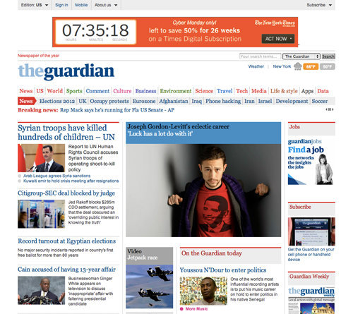 對于在線雜志或報紙一類需要呈現大量內容的網站來說,要打造簡潔的頁面設計方案則更加困難。不過英國的衛報(The Guardian) 以及一些同類型的在線報紙站點倒是向我們展示了通過固定寬度的網格布局實現簡潔設計方案的可行性: