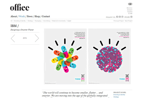 舉例來說,IBM的智能星球運動 (Smarter Planet campaign)涉及到多個方面的主題,與其相關的印刷品、插畫、圖表、人機互動素材等都遵從著同一套方案標準,包括幾何框架、線條風格、色彩飽和度等。無論是在網站,還是在平面媒體中,相關主題的視覺表現形式都具有高度的一致性。