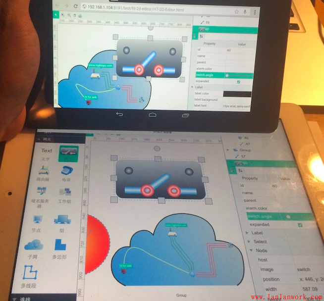 以上的例子對于名稱和位置的設置都是 demo 中隨意設置的值,真正的系統用戶一般會通過后臺數據庫查詢,然后根據業務數據內容構建圖元并設置相應的屬性。你會發現雖然在構建拓撲圖,但你80%的代碼都在和 Data 和 DataModel 打交道,這兩個又是什么鬼?其實絕大部分 HT 的客戶開發完整個系統都沒必要認真學習《HT for Web 數據模型手冊》,也不用管 HT 采用的是啥 MVC/MVP/MVVM 框架,需要深入了解的可閱讀 http://www.hightopo.com/guide... 手冊
