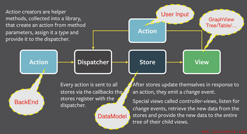 HT 的 DataModel 相當于 Flux 中的 Store 模塊,拓撲圖、樹和表格這些自然對應 View 模塊,一般發起 Action 動作就是后臺數據變化,或者用戶手工輸入表格屬性值之類,但最終都不是直接修改 View,都是從 Data/DataModel/Store 發起修改,然后數據模型派發事件給所有 View,最后 View 根據不同事件做相應的處理。
