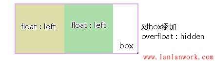 對兩個孩子使用float:left,我在上一篇浮動布局講過,這是父元素會高度坍塌,所以要閉合浮動,對box使用overflow:hidden,效果如下: