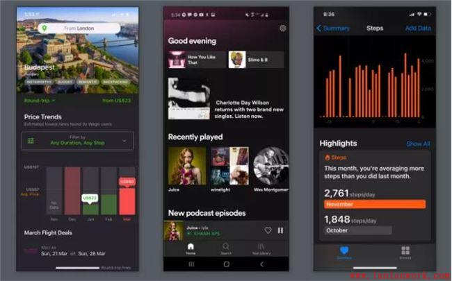 暗黑UI設計正確的手機應用:Wego、Spotify和蘋果(Android和iOS)。