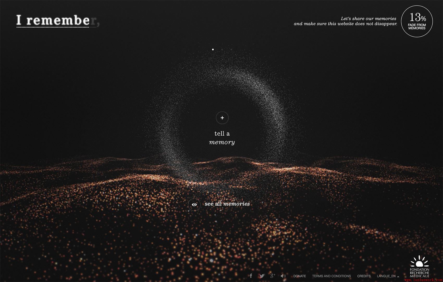 對(duì)于I Remember網(wǎng)站,主界面(動(dòng)畫)立即引人注目,因?yàn)樗埢?dòng)。雖然動(dòng)作和界面是功能性導(dǎo)航工具,但視覺設(shè)計(jì)師利用這些元素的潛在損失作為傳達(dá)網(wǎng)站潛在使命的方式:阿爾茨海默病。就像組織為其籌集資金的患者的褪色記憶一樣,如果沒有積極的互動(dòng),網(wǎng)站就會(huì)慢慢消失。