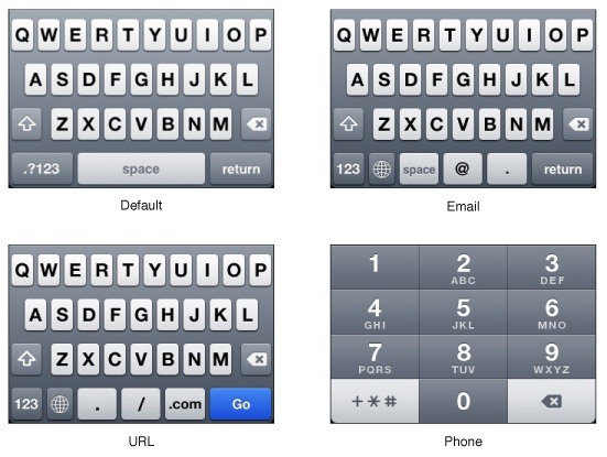 - 智能手機的系統(tǒng)平臺當中通常都會內(nèi)置一些針對不同類型內(nèi)容的鍵盤,例如文本、數(shù)字、Email、URL等。在你的應(yīng)用中,確保針對不同的內(nèi)容類型使用對應(yīng)的鍵盤,提升用戶輸入的效率。