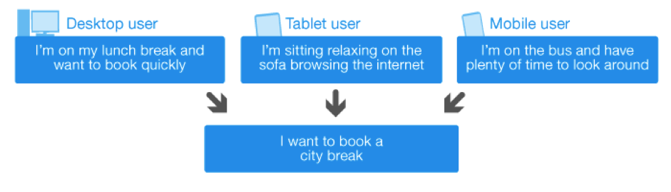 過去,我們通常會假設(shè)用戶在使用移動設(shè)備訪問網(wǎng)站時,其行為都是高度目標(biāo)驅(qū)動化的,例如在旅途中獲取酒店地址、預(yù)訂房間一類。但實(shí)際情況不僅如此——智能手機(jī)、平板電腦等各類移動設(shè)備的用戶,會越來越多的在相對穩(wěn)定從容的狀態(tài)下使用網(wǎng)絡(luò)。所以在很多時候,用戶使用不同設(shè)備的目標(biāo)差別并沒有想象的那么大,我們不能片面的假設(shè)不同類型設(shè)備的用戶對功能的需求差異。