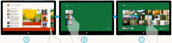 無論在iOS還是Windows中,這兩個手勢在很多時候都被用作放大或縮小內容對象的尺寸。不過對于Metro應用來說,它們還可以通過Semantic Zoom來實現內容層級間的導航。用戶可以捏合某個內容對象,來進入它所在的相關內容組。不過,當用戶正在以全屏模式瀏覽單張相片的時候,捏合與張開的手勢還是會被用來調整圖片的尺寸。