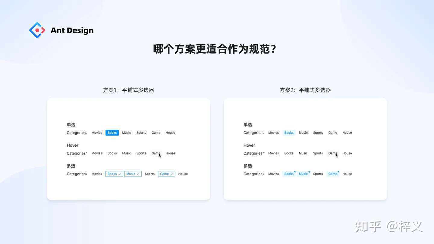 以我們開篇第四個問題提到的組件「平鋪式多選器」為例,我們到底該選哪個方案作為規范納入設計系統當中呢?