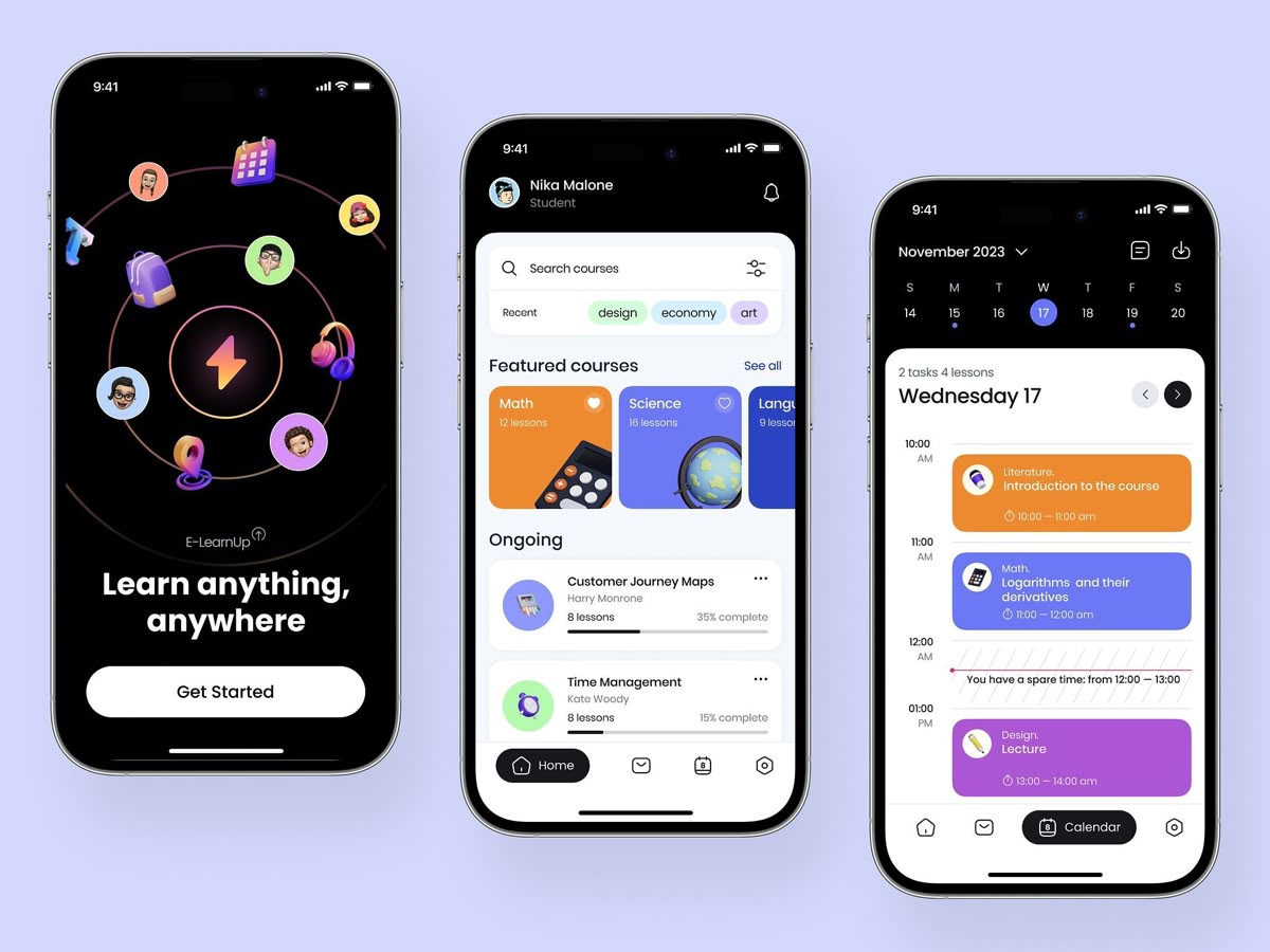 來看看這組設計,色彩搭配既形成鮮明對比,又保持和諧統一,3D 元素的運用增強了界面的層次感與視覺吸引力。在布局上,功能分區清晰明確,課程展示板塊與日歷時間管理板塊的排版直觀有序,能為用戶帶來流暢的使用體驗,高效適配學習場景的需求。