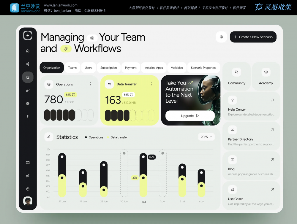 • 功能布局:頂部標(biāo)簽區(qū)分組織、團(tuán)隊(duì)、訂閱等模塊,核心區(qū)展示運(yùn)營數(shù)據(jù)卡片與統(tǒng)計(jì)圖表,右側(cè)整合輔助功能入口;