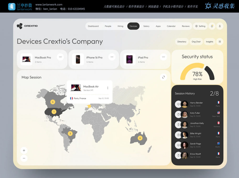 • 核心功能:全球設(shè)備分布地圖以深淺灰度區(qū)分區(qū)域,黃色標(biāo)記設(shè)備數(shù)量,懸浮卡片可快速查看設(shè)備詳情;右側(cè)安全狀態(tài)儀表盤與歷史會(huì)話列表,讓管理員對(duì)設(shè)備風(fēng)險(xiǎn)和使用記錄一目了然。