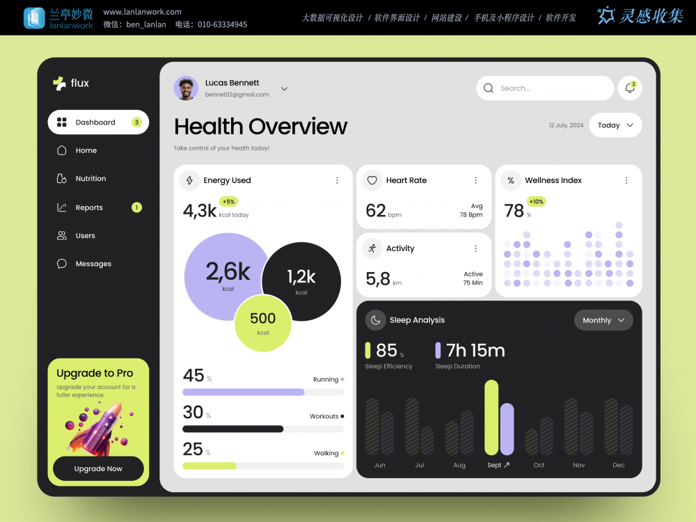 • 功能布局:核心區(qū)聚合熱量、心率、健康指數(shù)等高頻數(shù)據(jù)卡片,下方分運(yùn)動(dòng)占比、睡眠分析模塊,支持時(shí)間篩選,左側(cè)導(dǎo)航功能分類清晰;