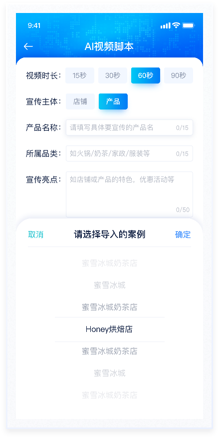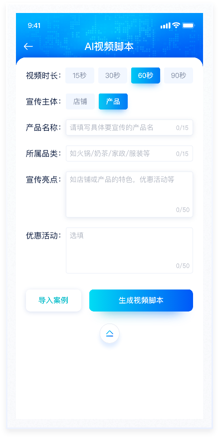 AI生成視頻腳本是用戶輸入相應條件后,AI大模型通過系統算法生成視頻內容。整體風格較為科技感,因此在配色上使用藍色漸變及較重投影,符合產品屬性,能夠突出產品的創新性和先進性。使用戶在使用過程中感受到強烈的視覺沖擊和沉浸感,這種體驗有助于增強用戶對產品的興趣。