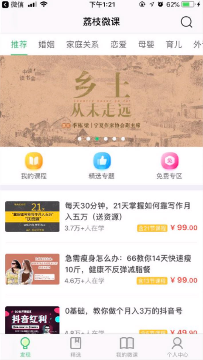 3.中間以三個(gè)圖標(biāo)按鈕表示我的課程,精選專(zhuān)題,免費(fèi)專(zhuān)區(qū)快捷入口方便用戶(hù)來(lái)回 切換;