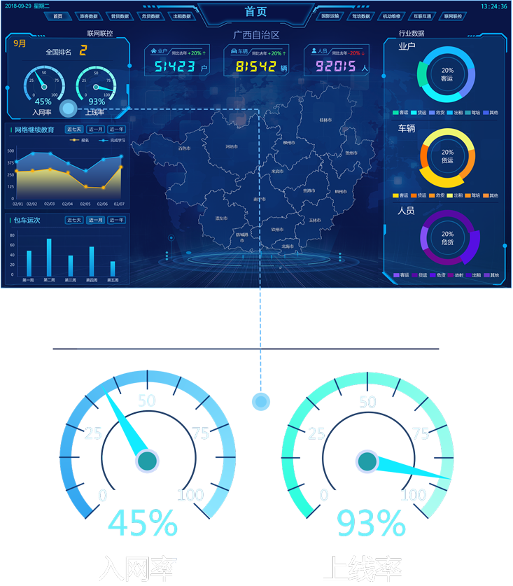 儀表盤:入網(wǎng)率和上線率用儀表盤的形式來展示,整體增加了整個(gè)頁面的科技感。兩個(gè)儀表盤 分別采用藍(lán)、青兩種比較亮的顏色同是也有輕微的漸變。儀表盤沒有全部封閉,下邊由數(shù)字顯示當(dāng) 前具體的百分比。